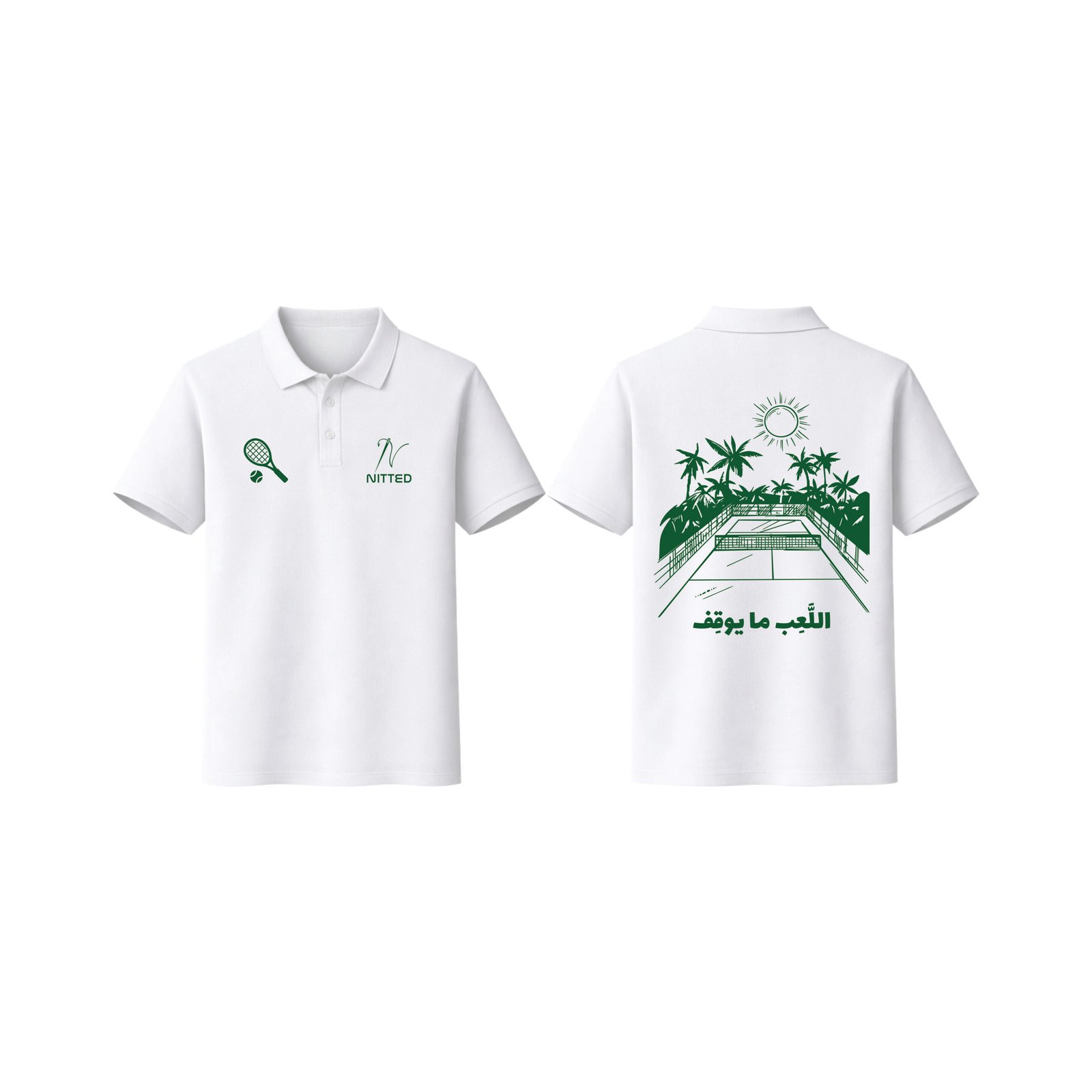 Premium black polo shirt made from high-quality cotton, designed for comfort and durability. Features a modern front and back design by Nitted. The front includes a clean, minimal Nitted logo, while the back showcases a bold graphic inspired by tennis culture with the phrase “اللعب ما يوقف”. Perfect for casual wear, sports style, or exclusive branding